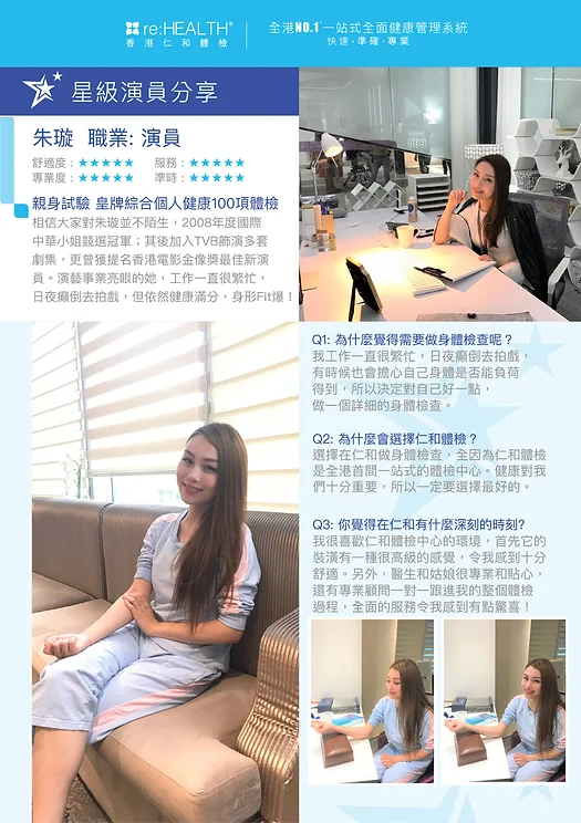 相信大家对朱璇并不陌生,2008年度国际中华小姐竞选冠军;其后加入TVB饰演多套剧集,更曾获提名香港电影金像奖最佳新演员。演艺事业亮眼的她,工作一直很繁忙,日夜癫倒去拍戏,但依然健康满分,身形Fit 爆。 Q1: 為什麼覺得需要做身體檢查呢? 我工作一直很繁忙,日夜癲倒去拍戲,有時候也會擔心自己身體是否能負荷得到, 所以決定對自己好一點,做一個詳細的身體檢查。 Q2: 為什麼會選擇仁和體檢? 選擇在仁和做身体检查,全因為仁和體檢是全港首間一站式的體檢中心。 健康對我們十分重要,所以一定要選擇最好的。 Q3: 你覺得在仁和有什麼深刻的時刻? 我很喜歡仁和體檢中心的環境,首先它的裝潢有一種很高級 的感覺,令我感到十分舒適。另外,醫生和姑娘很專業和貼心, 還有專業顧問一對一跟進我的整個體檢過程,全面的服務令 我感到有點驚喜!